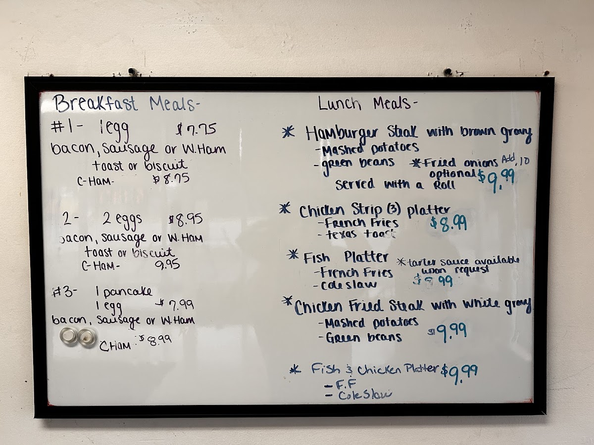 Throughout the day, the menu extends into lunchtime with classic American comfort meals such as Hamburger Steak with Brown Gravy, Fish Platters, and Chicken Fried Steak with White Gravy. Light sandwiches like Chicken Wraps or Club BLTs provide casual, easy bites that match the friendly, down-to-earth environment.